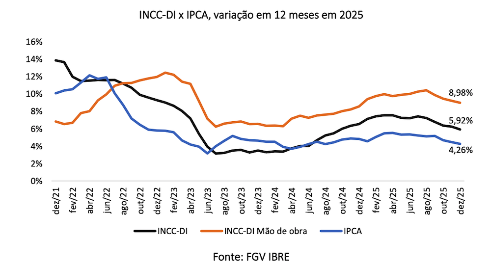 Em dezembro de 2025, o INCC-DI subiu 0,21%, fechando o ano com variação acumulada de 5,92%. Quando olhamos os componentes desse índice, a pressão sobre mão de obra fica evidente: